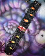 Double-layered, handsewn, fully leather construction specially designed to protect your precious neck meats. Featuring genuine coyote teeth, glass cabochon eyes, and finished in heavy gauge linen thread.