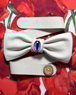 Carefully crafted from the softest white pig leather, featuring a glass cabochon eye. Mounted on a double-layer leather strap, with coconut shell button.